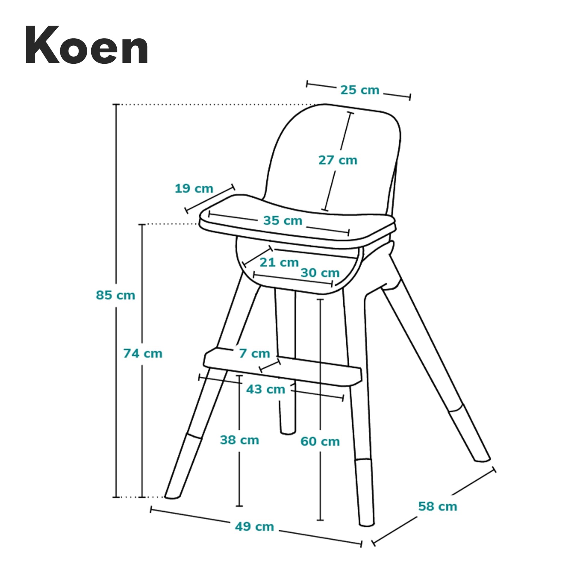 - Ajuste de altura graças aos pés facilmente desaparafusáveis, as duas alturas de Lionelo Os koen são fáceis de ajustar. A altura mais alta é para alimentar bebés pequenos e a altura mais baixa para crianças mais altas como uma cadeira normal.